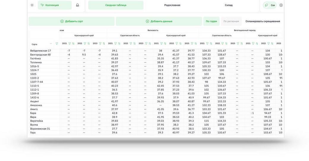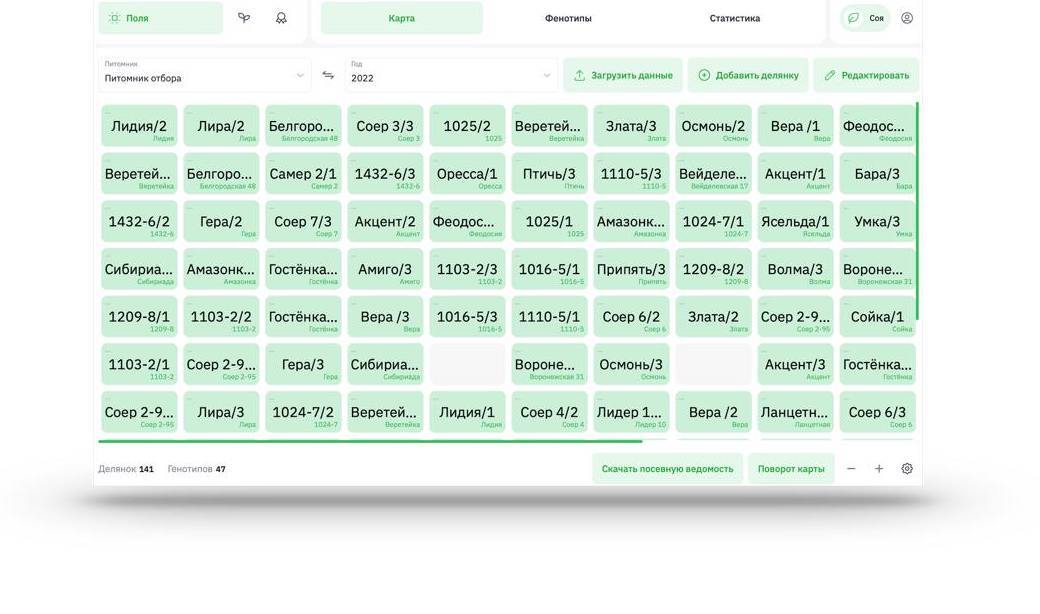 Платформа позволяет планировать и регистрировать все полевые работы, обеспечивая цифровое управление селекционным процессом, включая сквозной контроль и управление от склада до полевых исследований.